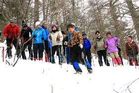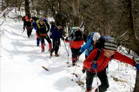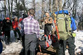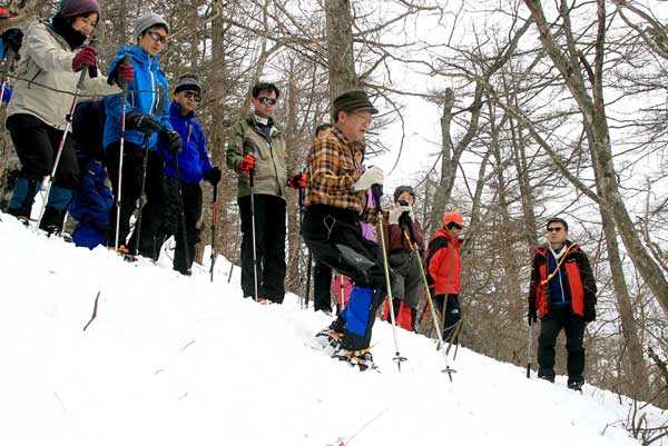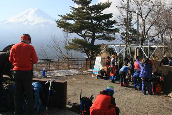 当初の予定では富士山五合目周辺だったが、降雪が続き交通手段が得られないことから目的地を三ツ峠に変更した。コースは、河口湖駅からカチカチ山ロープウェイを使い、天上山を経て三ツ峠・開運山を目指す往復路。 午前6時30分、立川駅に集合。車での参加、途中駅での合流など、メンバーは22名。天候は晴れで、富士急行線の車窓から富士山、三ツ峠などが豪快に眺められた。雪が溜まり、歩きにくい道を車にビクビクしながらロープウェイ駅へ。駅で全員集合。これでひと安心。 始発で一気に山上駅に到着。佐藤講師から注意事項を受け、準備体操のあと3班に分かれて、まずは天上山を目指した。それぞれのリーダー、サブリーダーは1班が佐藤守・佐藤英子。2班が西村智磨子・岡義雄。3班が河野悠二・小野勝昭。本来は受講生として参加していただいたが、受講生が多いために3班態勢となり、やむなくお願いすることにした。まるで登山教室の布陣だ。