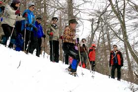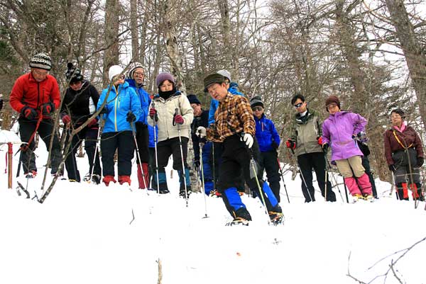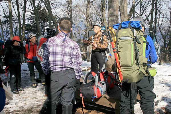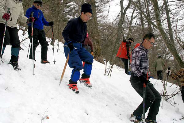 さらに雪が多くなったが、大きなアップダウンもなく木無山の登りにかかった。ここから急登が始まるが、すでに時刻は1時半に近い。帰りの時間を考慮して、このあたりで、登下降、斜登下降、トラバースなど、机上講習会の内容を実践する講習を約40分行った。雪が締まっていないため効率のよい講習は行えなかったが、雪上講習が初めての受講者は、楽しみながらもアイゼンワークに親しめたと思う。