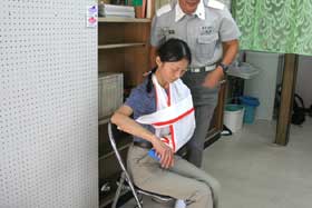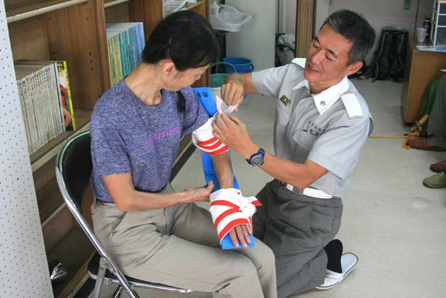 休憩を挟んで、骨折・捻挫の応急処置に移った。救助隊は、梯状副子(ていじょうふくし)という固定具を備えている。梯子状の針金をウレタンのようなもので覆い、患部の形状に応じてフレキシブルに折り曲げられるようになっている。腕の骨折を想定した実演を見せてくれた。