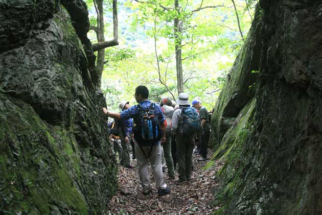 切り通しへは、こんなところを登るのかい、というようなところを登る。今回唯一の「難所」だが、ここは裏道。一般的には「正しい道」から切り通しには行ける。その正しい道に合流してわずかに歩けば、切り通しが見えてくる。巨岩が、まさに切り開かれている。岩を削った痕跡は、300年以上前の大事業を偲ばせるようだ。すぐそばの高みには神社が祀られていた。