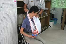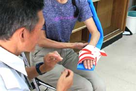 まず、時計や指輪をはずす。梯状副子を腕に合わせてセットし、細長く折った三角巾を副子ごと巻き付けて手の部分を固定する。次に上腕を同様に固定。首から回した三角巾で腕を吊る。腕が振れて動くようだったら、吊った三角巾の上から別の三角巾で胸回りを固定すればいい。このとき、手の指が見えるようにしておくのがポイント。爪の様子で血流の様子が分かるからだ。