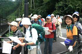 数馬峡橋を渡り、川合玉堂の歌碑などを愛でながら青梅街道に出る。ここには横断歩道がないので、いつも気を遣うところだ。休憩を挟んで、石井リーダーが向かうのは数馬の切り通し。「元禄16(1703)年に、氷川・栃久保両村の資力、労力で完成。これにより小河内方面、多摩川南岸と五日市方面、日原・大丹波と秩父方面の交通が密接になった。昭和52年11月3日、奥多摩町指定史跡となった」と、大多摩ウォーキングトレイルのマップに書いてある。