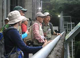ここの魚道はアイスハーバー型魚道で、その設計者が安全委員会の西谷委員。多摩川には世界で初めて設置されたハーフコーン型魚道などがあり、これらの設置も西谷委員が指揮したもの。白丸ダムを渡った先の休憩所で、ひととき西谷委員の話を伺った。魚のウロコのある・なしの話。また、魚は胸びれを使って魚道を遡ることが分かってから、魚が通る部分は角を取って丸くしたという話は面白かった。渓谷歩きが楽しめる遊歩道を歩いて急な坂を登り、鳩ノ巣駅に到着。ここで解散とし、有志一同で反省会場に向かった。
