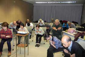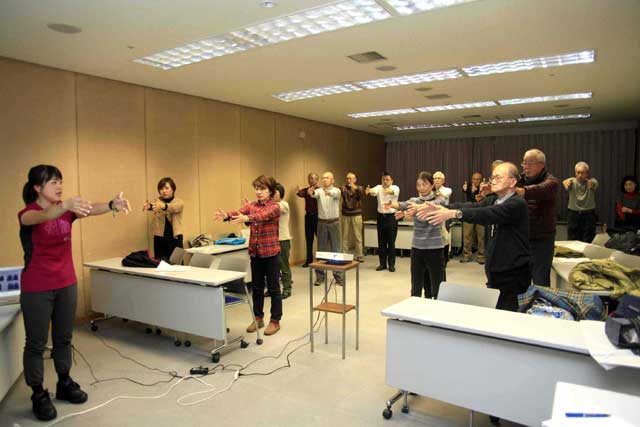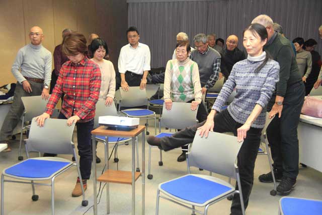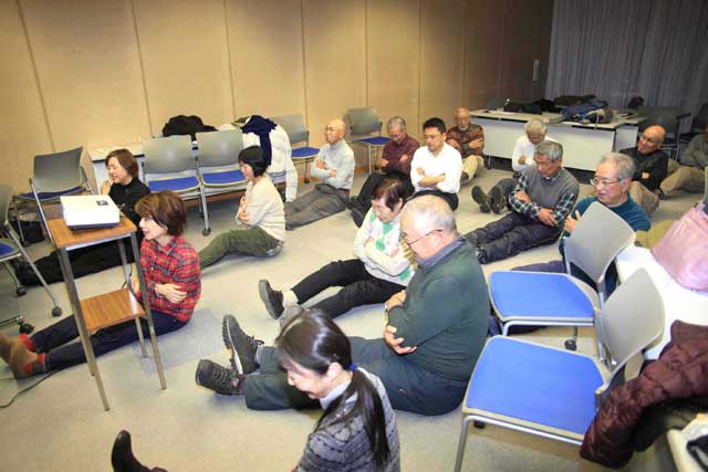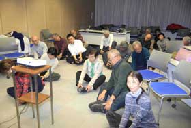 ストレッチに続いて、椅子に浅く腰掛け、腕を胸元で組んで前屈・後ろ伸ばしを繰り返す腹筋運動。座った状態で脚を素早く上下させる運動。宮ア講師の手拍子に合わせてスタート、ストップを繰り返す。これが意外と疲れる。次に、座ったまま正面を向き、体幹だけ左右に捻る運動。体軸をしっかり正面に向けるのが難しい。だから腹筋や脇腹に効果があるのだろう。次に大腿四頭筋に効くのが椅子に座ったまま片脚を伸ばして水平以上に上げる運動。腿がきゅっと締まって攣りそうだ。これを両脚でやるのは至難。どの運動も椅子の背もたれに背中をつけてはいけないというのがミソ。「お尻を使った運動」は、あぐらをかいて座り、両方の足の裏を合わせて股関節を広げる。次いでヤジロベエのように体を左右に揺らす。さらに円を描くように体を左右に回す。最後は両脚を投げ出してお尻を使って歩く「お尻歩き」。これには参加者も大汗。脇を捻る運動も加わるので、とてもよく「効く」。最後は呼吸筋のトレーニング。鎖骨の下を探って大胸筋ストレッチ。肋骨の間に指を入れる肋骨筋ストレッチ。ストローをぷっと吹くイメージの胸筋トレーニング。腹横筋を広げるトレーニング。どのトレーニングも、普段使わない筋肉を動かすので楽しかった。広い会場が確保できなかったのが残念だったが、宮ア講師の明るく楽しい指導で充実した講習会だったと思う。
