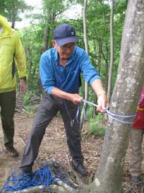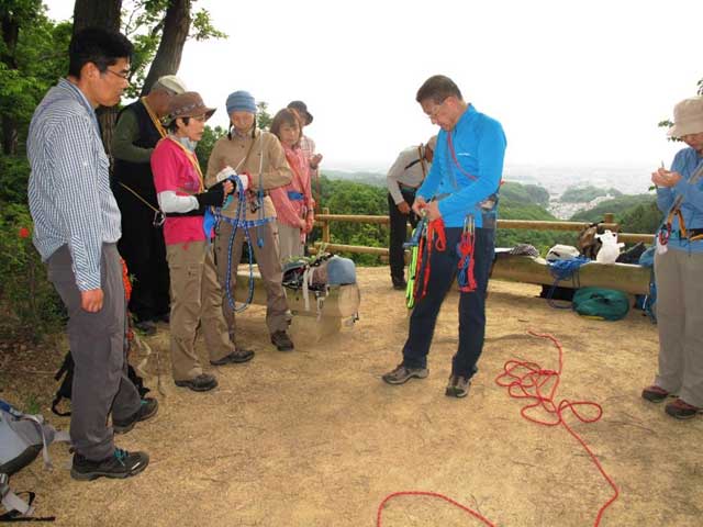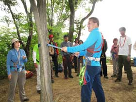 5月15日、青梅丘陵でロープワーク講習会が開催された。2月23日に立川市女性総合センターで行われた机上講習の実践編である。講師は机上講習と同じく、安全委員会の小山義雄会員が務めた。