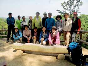 青梅駅に集合し、梅岩寺の脇から青梅丘陵へ。駅から20分ほどで会場の展望広場に到着した。曇り空ではあったが、都心方向の眺望がすばらしい。