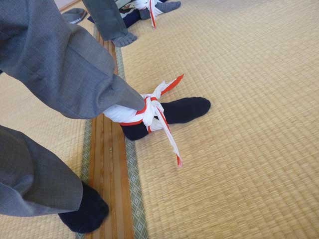 一つ目は「前額部」を負傷時の包帯。二つ目は「前腕部」を負傷時の包帯。三つ目は「腕」を骨折等時の腕吊り方法。四つ目は「膝」を負傷時の包帯。五つ目は「足首」を捻挫等時の固定方法。六つ目は「下腿部等」を骨折の固定方法、の実習を行った。