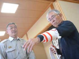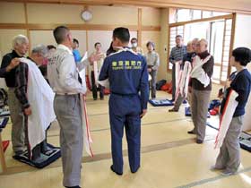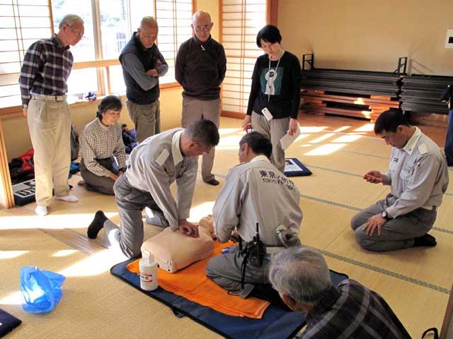 講師は、昨年と同様に奥多摩消防署の齊藤係長である。救急隊員の松本、杉本の両氏が支援し、石川奥多摩消防署長が見守る中で講習会を実施した。会場は、奥多摩消防署が手配した奥多摩町福祉会館の広い和室である。