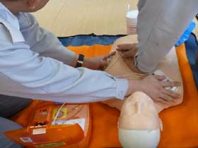 後半は、心臓マッサージ(胸骨圧迫)とAED(自動体外式除細動器)による心肺蘇生方法を実習した。救命処置の開始前には、必ず現場周囲状況をよく確認し、救助者自身の安全を確保することが重要である。心肺停止状態の人に対する心臓マッサージとAEDを使用した心肺蘇生処置を全員で行う。心肺蘇生は心臓マッサージを優先に実施し、人工呼吸(口移し式)は省略可である。心臓マッサージのやり方とAEDの使用方法が説明された。AEDは電源を入れてAEDの音声メッセージに従って操作する。AEDが自動的に心電図解析を行って電気ショックが必要かどうか判断してくれる。AEDからメッセージ―がでるまで心臓マッサージを続けること。心肺蘇生処置は、周囲の人と協力しながら(心臓マッサージは適宜交代)、救急隊に引き継ぐか救護者に何らかの応答があるまで続ける。