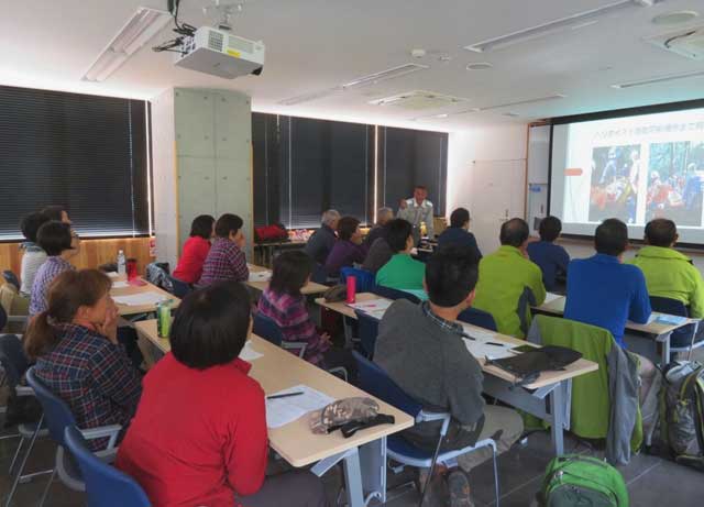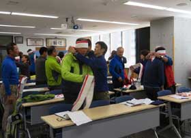 奥多摩消防署4階講堂に集合した。講習会は、室内講習と野外講習があり、まずは室内講習から開始。同署齋藤係長から奥多摩地域の山岳事故発生状況、山岳救助隊の活動内容などをパワーポイントで分かり易く説明を受けた。奥多摩地域の遭難事故は相変わらず多く発生し、山岳救助隊活動の大変さが理解できた。次に、応急手当技術として三角巾の使用方法を受講した。二人一組となり、頭、腕、膝を負傷した際の応急手当をお互いに実施。応急手当技術は何度受講しても忘れることが多く、今後も機会を作り講習会を実施したい。最後に、山岳救助要請の連絡先、連絡必要事項などを質疑形式で説明を受けた。室内講習終了後、奥多摩消防署長の挨拶を受けて、野外講習会場に移動した。