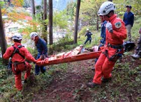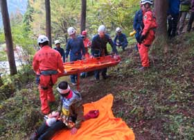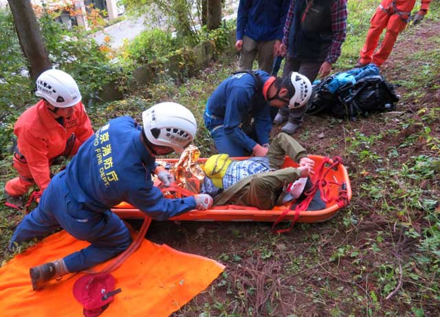 野外講習会は、山岳救助隊と連携しての救助活動シミュレーション実施だ。山岳救助隊と連携した講習は大変貴重な経験であり、参加者は緊張して消防署前の山岳救助隊訓練場所に集合した。シミュレーションは、山行中にパーティーの1名が転倒、下腿部分を負傷し自力歩行が困難、リーダーが救助要請するというストーリーで実施。参加者からパーティー要員7名(リーダ河野悠二)を選出。残りの参加者と消防署員が見守る中でシミュレーションを開始した。パーティ―が登山道を歩く。途中で1名が転倒転落。リーダーは事故者の許に急ぎ負傷状態を確認。全員に状況説明し、救助要請を決定。介護と記録担当を選出して事故者介護と事故記録を行う。リーダーは本番同様に奥多摩消防署へ救助要請の電話をする。消防署事故受付から「依頼者氏名、事故発生場所、発生状況、事故者の氏名、年齢、性別、住所、負傷状態、山行ルート、パーティー人数など」の質問があり、救助要請時の情報整理の必要性を実感した。山岳救助装備の隊員7名が担架等の救助用具を背負い駆け足で到着し、緊迫した空気に包まれる。山岳救助隊は隊長指揮の下で、まずは事故者の負傷状況を診断。一方、リーダーに対し事故発生状況、事故者の氏名や家族の連絡先などのヒアリングを実施する。事故者は担架で搬送されることになり、山岳救助隊の担架に乗せられて登山道を下山した。搬送先の病院は、消防署から家族へ連絡する仕組みであるとのこと。私達も事故者家族への早い連絡が必要であることが分かった。これで山岳救助隊との連携シミュレーション講習は終了したが、事故発生で緊迫する精神状況の中で救助活動を行う大変さを身をもって実感できた。そして、本番での事故発生が絶対にあってはならないことを強く認識した講習会であった。