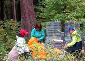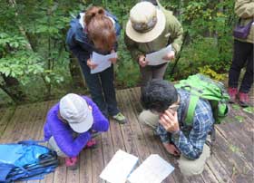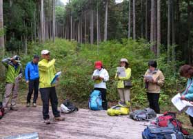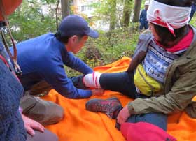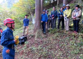 奥多摩消防署講習会の終了後、午後の講習会実施場所の奥多摩町登計森林セラピーロード尾根広場に移動。徒歩約20分で到着し昼食をとる。講習会の実施内容は、午前の講習会と同様のストーリーにより参加者全員で救助活動するシミュレーション講習だ。参加者をA班とB班に分け、その他に留守番会員、山岳救助隊、山小屋管理人の各担当を設定し、安全対策委員会の指示で各班ごとにシミュレーションを実施した。