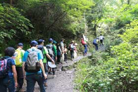 下山路では子供たちがナナフシを捕まえたり、ムササビの食痕跡がのこる葉っぱを見つけたり、大蔵講師がまたまたヤマカガシを捕まえたりと、さながら自然観察の場となった。14時10分、清滝駅へ全員元気に下山。トイレタイムをとり、599ミュージアムに帰ってきた。