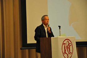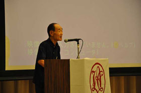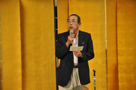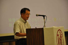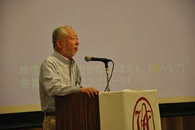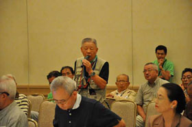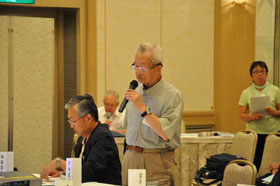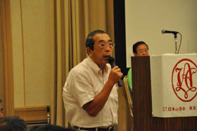 支部報編集者会議に続いて、会場を大会場に代えて支部活性化会員集会が開催されました。支部に所属する会員が一同に会して支部の活性化について討議を行なうことは初めての試みです。まず、広島支部の兼森志郎会員が約100人の参加者を前に基調講演を行ないました。引き続き全国の支部会員からの提言募集に応えて提案された方々の中から8名の方が提言内容を披露されました。