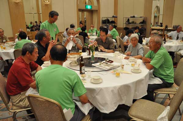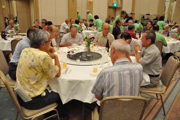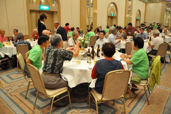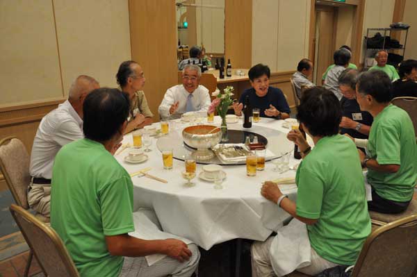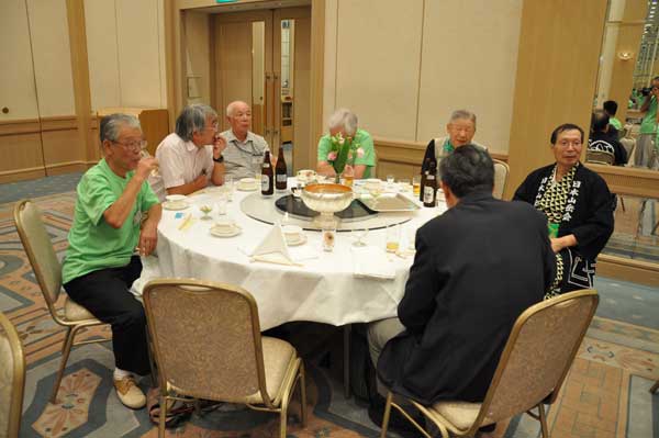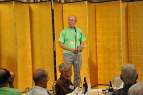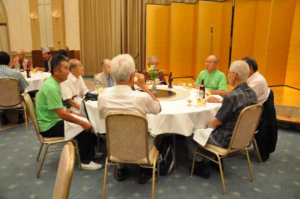 懇親会会場からの和太鼓の音に誘われて約150名の会員が多摩の山々の山名が掲示されたテーブルに着席しました。司会は坂本正智・実行委員会集会委員長です。竹中彰支部長、尾上昇会長の挨拶に続き、参加者最長老の広島支部本片山数雄会員(91歳)が乾杯の音頭をとり宴会は始まりました。