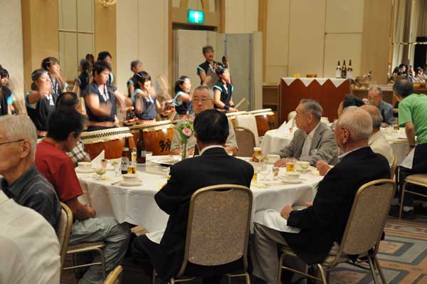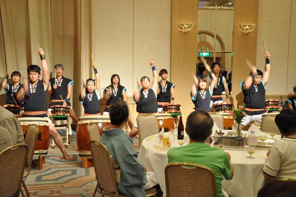 午後6時30分、和太鼓の腹に響く音に誘われて懇親会会場に150名ほどの参加者が多摩の山々の名前が書かれたテーブルに着き、メインイベントの懇親会が始まりました。暑かった今年の夏を振り返り、ヤマの話に花を咲かせ、親睦を深めました。