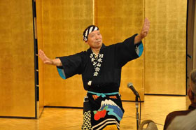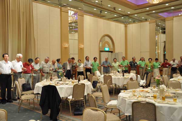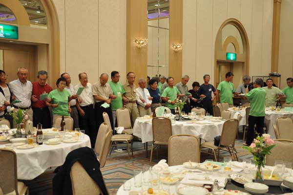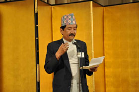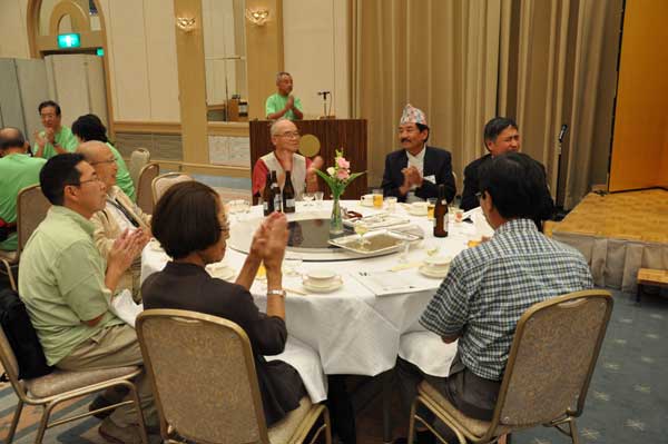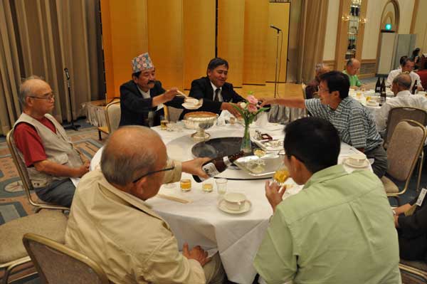 来賓は松田雄一、中村純二、宮下秀樹氏らの名誉会員とプミ・ラ・ラマ・ネパール山岳協会副会長です。支部から贈られた日本酒、焼酎、ワインが好評の内にどんどん消化されて宴たけなわの中、青森支部会員が余興として踊りを披露しました。恒例各支部の紹介が終わり、そろそろお開きの時間が近づいてきた時、神崎副会長が壇上に上がり、参加者全員で山の歌を唱うことになりました。最後は全員が腕を組んで一つの輪になり、「今日の日はさようなら」を合唱しました。名残惜しい中、酒井省二実行委員長のお礼の挨拶がありお開きとなりました。