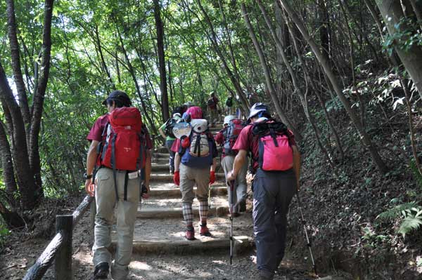 6日に行われた記念山行は、高尾山、高尾の森づくり、多摩御陵の3つのコースに分かれて実施されました。各コース合わせて84名が参加、酷暑のなか事故もなく無事終えることができました。