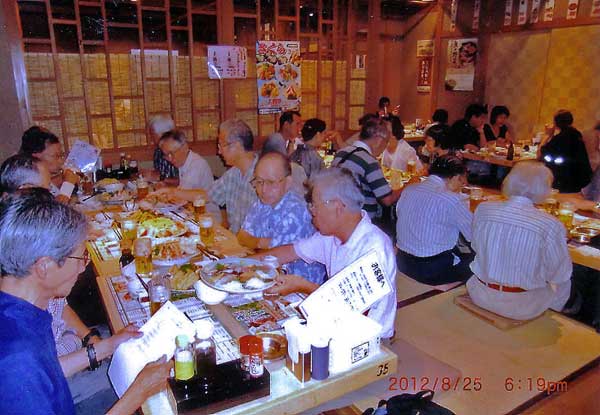 連日30度を超す猛暑が続き、雨乞いをしたくなるほどの炎天の乾ききった東京砂漠。正に暑気払いに相応しい、日中の暑さの冷め遣らぬ夕刻、22名の参加のもと、立川駅前の「さくら水産」にて開催した。