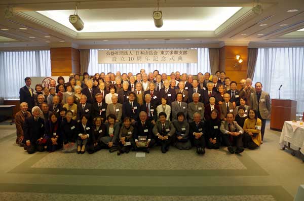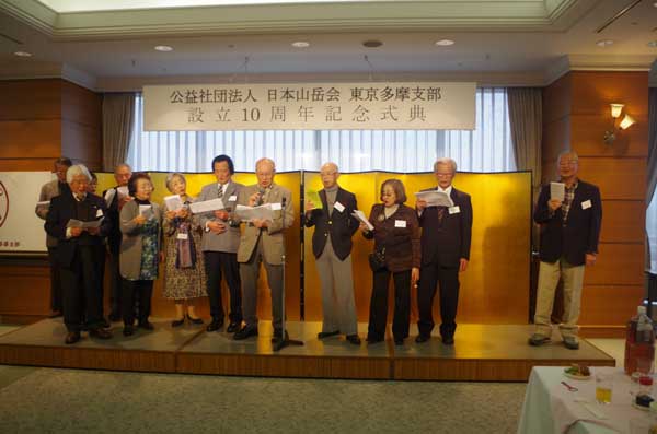 終盤には「山の歌を唄う会」の歌声が響き渡った。2時間を過ぎるころ、設立10周年記念事業実行委員会、橋清輝委員長が閉会の挨拶をし、本多祐造氏による恒例の”多摩の七つ締め“をもってお開きとなった。この日は、朝から小雪の降り続くあいにくの天候であったが、多くの参加者をもって盛会となり、また終始なごやかな雰囲気の良い祝賀会となった。