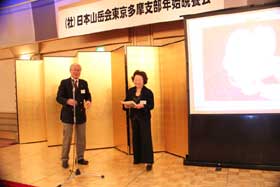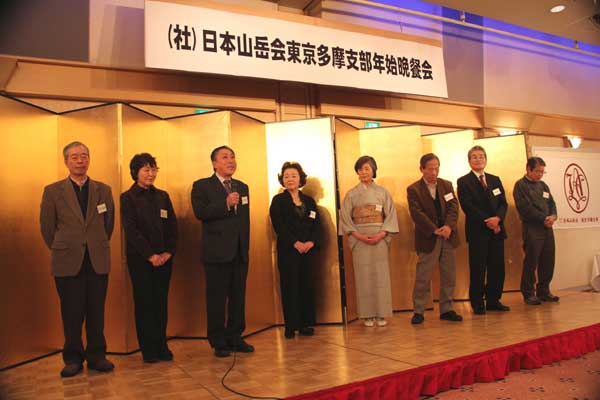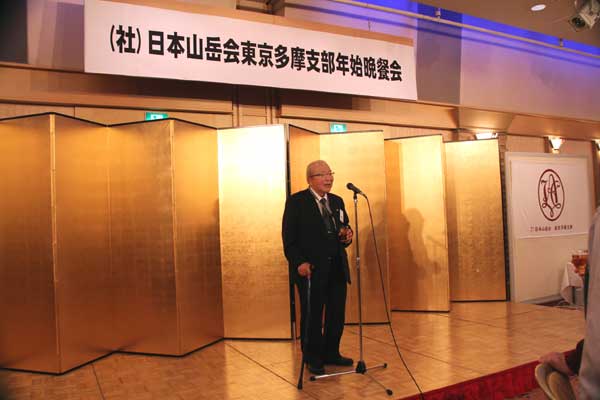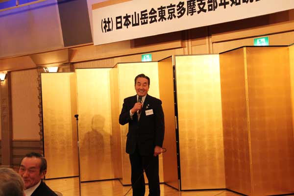 黙祷のあと、竹中支部長が、この一年間の活動を振り返りながら、「支部の山行、会合等に積極的に参加してほしい」と呼びかけた。次いで神崎日本山岳協会(JMA)会長が来賓として祝辞を述べ「東京多摩支部が先鋒になって行動してもらいたい」と檄を飛した。「実家に帰ってきた。身内の前で言いたいことを言わせてほしい」と次のように語った。