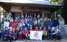 新年早々の第4回分境嶺踏査も参加49名と、相変わらずの大部隊となった。天候は晴れ。毎回ながら天候には恵まれている。増発バスのおかげで定時にみなさん、座って出発できた。石楯尾神社の境内で出発式・記念撮影を終え、グループごとに9:10に三国山に向かって歩き出す。今回の分境嶺は1時間程度と、計画の中でも最も短いルートになる。アプローチが登り2時間、下り1時間の計4時間の歩行予定である。