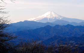 霜が降りた人家を抜け佐野川峠を経て、三国山の山頂には11:08に到着。計画では11:30だからかなり早いペースで進んでいることになる。ほぼコースタイムとおりのペースである。山頂からは真っ白な雪をかぶった富士山はもちろん、間ノ岳・農鳥岳、丹沢山塊、道志山塊などが、クッキリと見える。この時期ならではの絶景である。昼食にはまだ早いということで、先に進むことになったが、陽だまりもあったので軍刀利神社(ぐんだり)の元宮の境内で11:23昼食となった。それにしても天気はいいし、風もなく実に、恵まれた登山日和となった。