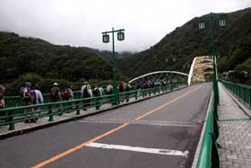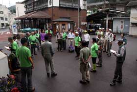 前日の夜半まで雨が降っていて、今回こそ雨天中止かとやきもきしていたが、予報は曇りで雨の心配がほぼないとのこと。JR奥多摩駅に体調不良で参加辞退された方2名と集合場所を間違えた方1名を除き、支部会員23名、一般参加者14名の総勢37名が集合した。受付を終了し駅前で竹中支部長よりご挨拶をいただいて出発式を行い、天候に恵まれた山行開始となった。今回も西東京バスのご協力により、我々だけの専用バスを用意していただき、登山口である深山橋に向かって出発した。