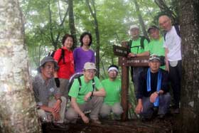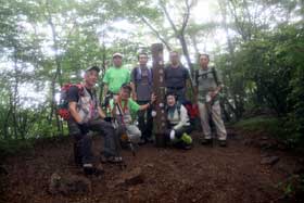道は展望もなく前日までの雨で蒸していて、急登が表れるたびに汗が噴き出るものの、時折風が抜け一時の安らぎを感じながら歩き続ける。この尾根は入小沢ノ峰から始まる分境嶺へのアプローチとなっていて、みなさんほぼ計画通りのペースで、直前の滑りやすい急登を経て、ようやくヌカザス山の山頂に到着した。滑りやすい急登に備え、用意してきたザイルが役に立ったようである。グループごとにヌカザス山山頂で記念写真を撮り、昼食を取りながら三頭山に向けて再び出発となった。