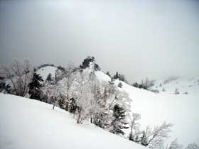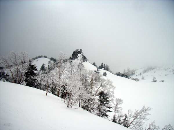 逢ノ峰(2110m)の西側を捲く水平な林道を進むと、やがて目の前に白根山頂(2160m)が青空の下にきれいに輝いて見えた。左に弓池を、右手に白根レストハウスを見て、292号線(草津から万座へ通ずる道)をわずか西に行き、すぐに白根山への上り坂にとりついた。 この頃から次第に霧が濃くなり、視界が悪くなってきた。この周辺は木が少なく、比較的平坦な雪原なので、踏み跡だけが頼りである。したがって、踏み跡がしっかり残っている火口展望台で引き返すことにした。