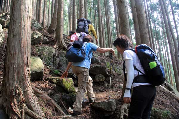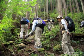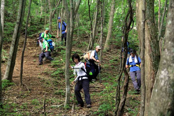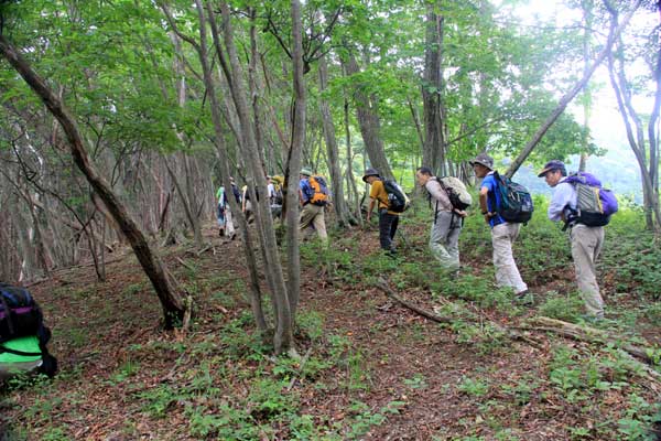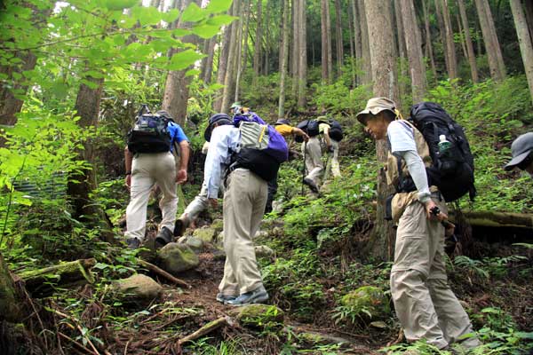 出発していきなりの急な下り。木や枝、ロープに捕まりながら、危なっかしく降りていく。結構長い下りである。それからは大きなアップダウンを繰り返すようになり、日向沢の峰へは加速度的に傾斜を増していく。それも長い。暑いのと相まって、結構きつくなる。そうこうしているうちに、遠くで雷音が聞こえ始め、雲の流れが相当早くなってきた。日向沢ノ峰への長い急登をぜいぜい言いながら登っていたら、あたりが急に暗くなり始めた。とたんにポツポツ雨が降り始め、あっという間に本降りとなり、急いでザックから雨具やカッパを取り出す羽目になってしまった。さっきまでの晴天が嘘のような天候である。おまけに急に気温が下がって肌寒くなってきた。土砂降りの中を進んでいるうちに、全体の歩行ペースが相当落ちてきたことがはっきり分かってきた。突然、先頭のリーダーから連絡があり、体調不良の方が出たとのことであった。分岐が近づいていたのは分かっていたので、なんとか分岐までは出てもらうようにお願いした。