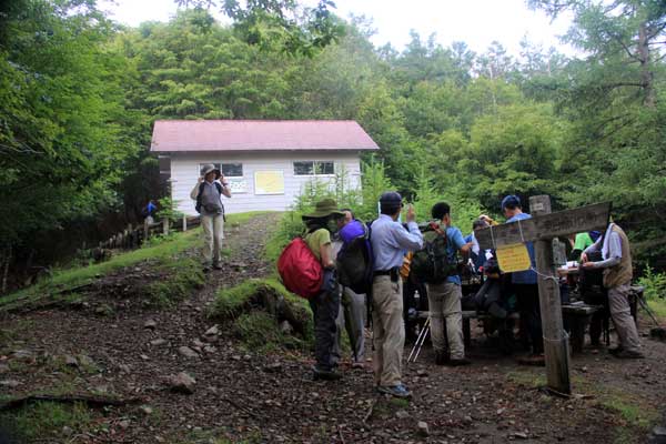 バスに間に合わないとなったらタクシーを使うしかないのだが、奥多摩駅にあったタクシー会社の営業所が廃業してしまい、あてにできない。その時、参加されていた石井秀典会員から、車の手配ができないか聞いてみるとの申し出があり、連絡先を何件か当たっていただいた。蕎麦粒山を出発したのが16時35分。途中で水場に寄りようやく一杯水避難小屋に到着したのが17時45分であった。これから日原まで1時間40分はかかるため、途中で日没となり下山予定が大幅に遅れることを覚悟した。