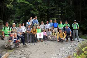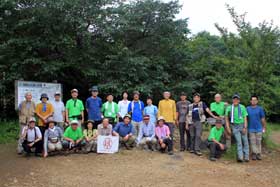 JR八王子駅南口みずほ銀行前に6時30分頃から参加者が集まり始め、集合時間の6時45分には受付を終了して24名全員が揃った。本日は分境嶺山行の中で核心部第2弾ともいうべき長い尾根歩きとなる。前回は核心部を12時間で踏破したが、今回も9時間という長時間踏破への挑戦である。加えて、梅雨明け後の連日の猛暑続きの天気。天候には毎回恵まれているが、熱中症対策には神経質にならざるを得ない。全員が揃ったところで6時50分にマイクロバスに乗車して川井駅経由奥茶屋キャンプ場を目指して出発となった。予定より早く8時15分に奥茶屋キャンプ場に到着。竹中支部長の挨拶後、体操・グループごとの注意点などをおこない、8時35分に棒ノ折山を目指して出発した。