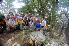 清らかな沢が流れる山葵畑の脇を通り、風の抜けない杉木立の急斜面を大汗かきながら登る。10時15分にようやく到着。天気は良いのだが、とにかく暑い。汗がなかなか引いてくれない。着いた山頂は明るく開けていて風も通り、展望もあるため長めの小休止とした。ここが分境嶺の本日の出発点。日向沢の峰、蕎麦粒山を経由して一杯水避難小屋で前回踏破した分境嶺とつながることになる。身支度を整えて、全員で記念写真を撮ってから10時40分に出発。いよいよ分境嶺縦走の開始である。