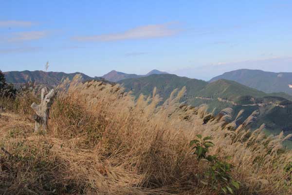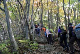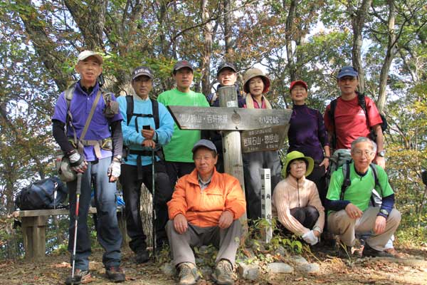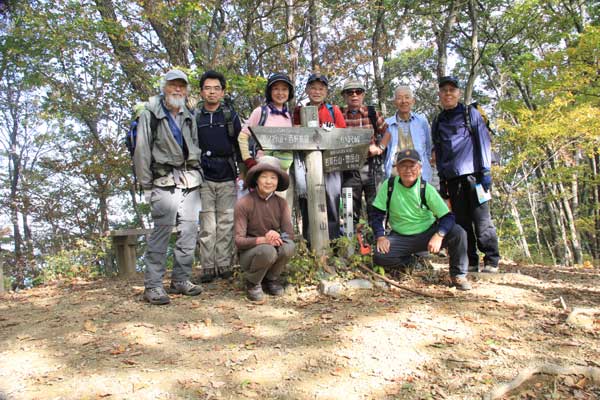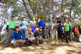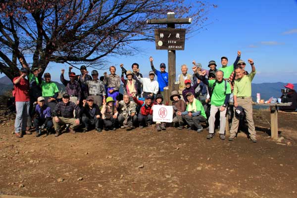 このコースは7月にも歩いているが、炎天下の中、風も通らない急登でへばったことを思い出す。本日は葉っぱが落ちて風も通り、空気も乾燥して絶好の登山日和となった。軽快に歩いて山頂には11時50分着。好天気のせいか山頂では大勢の登山者がいて、奥秩父方面の抜群の眺望を楽しんでいた。全員での記念撮影後、昼食とした。予定より早い12時20分に出発して、最後の分境嶺の歩きが始まった。あまり眺望には恵まれないものの、ところどころ開けたあたりで展望を楽しみながら、黒山を経て小沢峠に向かう。
