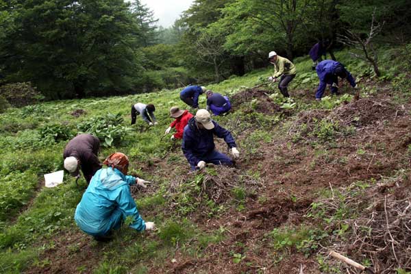 平成8年、山梨県より、保護する植物に悪影響を及ぼす懸念植物の積極的排除の許可が下り、ここに繁茂するテンニンソウを刈り取る作業が始められていた。テンニンソウは繁殖力の強い植物だけあって根をびっしりと広げており、他の植物に害を及ぼさないように注意しての刈り取り作業であった。小一時間もしたであろうか、雨が降り出し作業を中止、珍しい植物の話を伺いながら山荘に戻る。