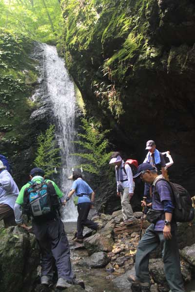 これから向かうロックガーデンは、御岳山(929m)の西側にある鍋割山(1084m)の東側山頂直下に源を発する河鹿沢と芥場峠の北側を水源とする灰汁場沢が綾広ノ滝の上で合流し御岳沢と名を変え、七代ノ滝の下流で養沢川となって十里木で秋川と合流する。 御岳沢綾広ノ滝から七代ノ滝の間の沢沿いが風光明媚であったことからこの間を岩石園(ロックガーデン)と呼び散策道、休憩舎、トイレ等が整備されている場所である。今年は七代の滝経由でロックガーデンに入る計画を立てた。神社の階段の途中から長尾平へ向かい、ここから一気に180m程下降すると滝壺の前に広いテラスを形成する第4段ノ滝に出会い多くの見学者で賑わっていた。滝の周りにはイワタバコの可憐な花が咲き写真を撮る人も多かった。