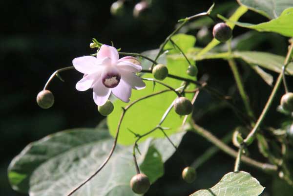 レンゲショウマ群生地は御岳山の北700mに位置する富士峰(883m)の北西斜面に約2万株とも3万株とも群生すると言われている。ケーブルカーを降りて1〜2分で入口に到着する。今年の御岳山は7月中旬頃から低温、日照不足が続きレンゲショウマの開花時期も10日程遅れたようで満足のいく観察は出来なかったことは残念であった。 レンゲショウマはキンポウゲ科の多年草でレンゲは「蓮華」蓮の華のことであり、葉がサラシナショウマに似ているところからこの名がついたと言われている。 又、東京都環境局2010年版の「東京都の保護上重要な野生生物種(本土部)」東京都レッドリストによると、レンゲショウマは南多摩地域では絶滅危惧T類(CR)で、ごく近い将来における野生での絶滅の危険性が極めて高いものとされ、西多摩地域(御岳山はこの地域)では絶滅危惧U類(VU)で、圧迫要因が引続き作用する場合、近い将来「絶滅危惧T類」のランクに移行することが確実と考えられるものと規定されている貴重な植物なのである。貴重種であるレンゲショウマがこれほど群生する地域は他にはないだろう。
