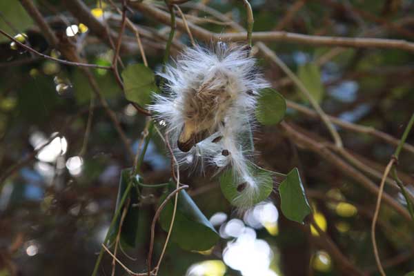 年始の挨拶を済ませ9時05分出発する。清滝駅内のシモバシラを観察、昨年同様のルートをとり東京高尾病院経由で2号路から3号路へ向かう。高尾山は1号路を挟んで南斜面(3号路側)には照葉樹林(暖温帯林)が、北斜面(4号路側)には落葉広葉樹林(冷温帯林)が拡がる特徴を持っている。3号路に入るとアサギマダラ(蝶)の食草として知られるキジョラン(鬼女蘭)が登山道の左右に現れ、丸く虫喰った葉を裏返すとアサギマダラの幼虫を観察することが出来た。また鬼女蘭の名の謂れとされる綿毛の種子を採取することもできた。