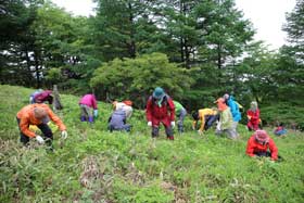 今回私達はこの繁りすぎたテンニンソウの除去作業をする。根茎は縦横に広がり他の植物の成長を阻害するアレロパシーを出すというテンニンソウ、他の植物に気をつけながらの除草作業であった。帰り道すがらこの時期にみられる高山植物の話など伺いながら山荘にもどる。