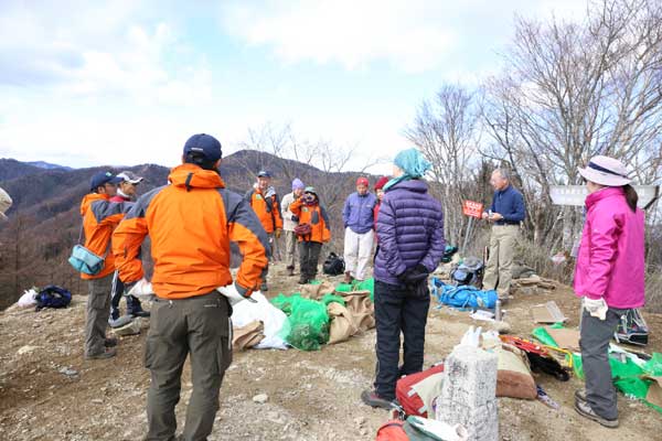 都レンジャーとの清掃登山協働作業は、昨年11月の川苔山に続いて今回で2回目である。前回は、都レンジャーと初めての協働作業であったので体験的な作業であったが、今回は前回の経験を生かした協働作業となった。また、前回は作業日が直前で決まったこともあり自然保護委員のメンバーだけの参加であったが、今回は支部員及び高尾の森づくりの会に募集をした結果、9名の方にご賛同いただいた。今回の山は、都レンジャー情報で七ツ石山頂の清掃となった。