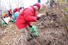 下山は、支部会員の車組とバス組を入れ替え、前車組は20分程早く下山開始し、作業時間の少なかった前バス組は、集積したゴミを都レンジャー達と一緒に担いで峰林道終点の駐車場まで降ろす。最終的に、奥多摩ビジターセンターに車組・バス組が集結し、解散ミーティングを行う。バス組の作業時間が少なかったので、1本前のバスで行動するべきと反省した。また、参加人員は、あまり多いと車の確保とゴミ降ろしの関係から10名前後が適当と感じた。後日、都レンジャーからの情報では、集積したゴミの重量は40sであったことを聞いた。