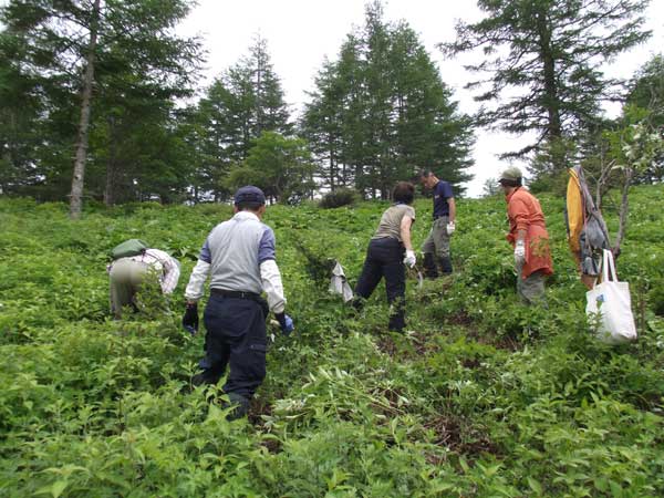 6月26日(木)〜27日(金)、前年度に引き続き三ッ峠アツモリソウの保護活動を実施した。三ッ峠山荘のご主人、中村氏の長年に渡る地道な保護活動と環境省、山梨県等の支援を受けた結果、盗掘等で減少したアツモリソウは300株まで復活した。また、開花までに10年を要するとのことだが現在200株ほどの子株も成長している。今回は、アツモリソウを取り囲む繁殖力の強い地下茎のテンニンソウの除去作業を行った。
