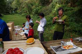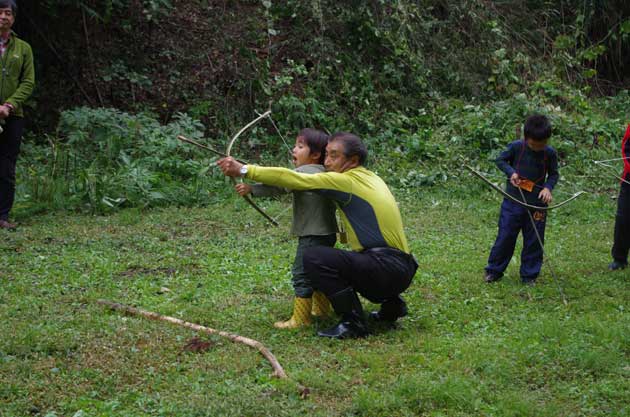 天気予報ではほぼ一日雨という予報でした。が、参加者の普段の行ないがよかったのか、朝は小雨でしたが、昼には青空も顔を出しました。一週間まえにシュミレーション〈自然観察、ピザつくり、弓矢の準備〉をしたので、スムーズに進められました。石神前駅で参加者の受付、会場まで徒歩移動、会場に着いてから開会セレモニーとして、ガイダンス、自己紹介、アイスブレーキング(最初にみなさんと溶けあうために)を行ないました。