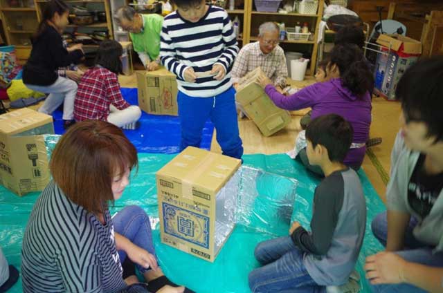 10時に「石神前」駅に集合し、いろいろな花が咲く、のどかな道を歩いてノースフィールドへ。小雨が降ってきたので室内で開会セレモニー、ガイダンス、自己紹介を行い、少し打ち解けあってから早速ものづくりに着手。初めは牛乳のパックを切ったり折り曲げたりして笛を作った。息が当たる所の形によって、音が出たり、でなかったりで一喜一憂するも、おたがいに教え合って無事完成。次は、昼食用のピザパイを焼くための窯をダンボールで作る作業。ダンボールを広げ、窯の内側に断熱用のアルミフォイルを貼り、覗窓をあけ、組み立ててガムテープで固定し、2段の網を支える長い櫛を刺し完成。はさみ、カッター、ボンド、ガムテープ、マジックペンなどいろいろな道具を工夫しながらうまく使って手際よく作り上げました。