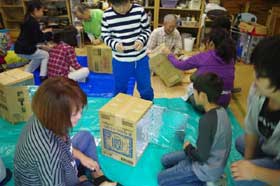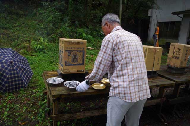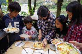今度は肝心のピザの生地づくり。こねたり延ばしたり、皆、丸く延ばすのに苦労していました。スタッフがあらかじめ準備したたくさんのトッピングを乗せて材料の完成。それにしも、エプロンまで準備してきた家族がいたのには恐れ入った。こんな忙しい合間に、城所先生の「天気のお話」があった。今回は「台風について」で、ちょっと難しかったが、最近沢山発生し被害も甚大なので、子供なりに関心が深かったようです。外では八木さんが、1時間掛りで雨の中でカッパを着て火を起こしてくれたお蔭で、材料が完成するころ5つの窯で使う火の準備が整い、ちょうどその頃から雨がやみ、屋外でダンボールの窯によるピザ焼きが始まった。1回で2枚焼くのに20〜30分かかるが、中には同じ火種で3回も焼いた窯もあった。自分たちで準備した食材で、しかも自分たちで窯まで作って焼いたピザがまずいはずがない。中には参加できなかった家族にお土産として持ち帰る人もいた。