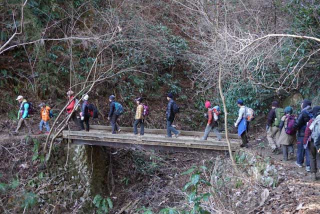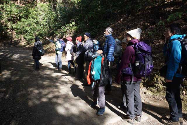 冬晴れが続く年始めの一日、恒例となった「高尾山シモバシラ観察会」が行われた。今回はこれまでで最多の83名の一般応募があり、抽選で選ばれた参加者とスタッフ合計34名が3班体制で行った。冬休み中とあって親子連れの姿もあった。10日前の下見では、残念ながら空振りのシモバシラだったが、今朝は冷え込みが強く、風も無い好条件が揃った。