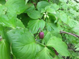 尾根道には白い愛らしい花はコゴメウツギ・マルバウツギ、ワインレッド色の花を付けた珍しいハンショウズルも見られました。シャガは種で無く地下茎から増えるので土手に多く植えられていると教えていただきました。群生してきれいでした。