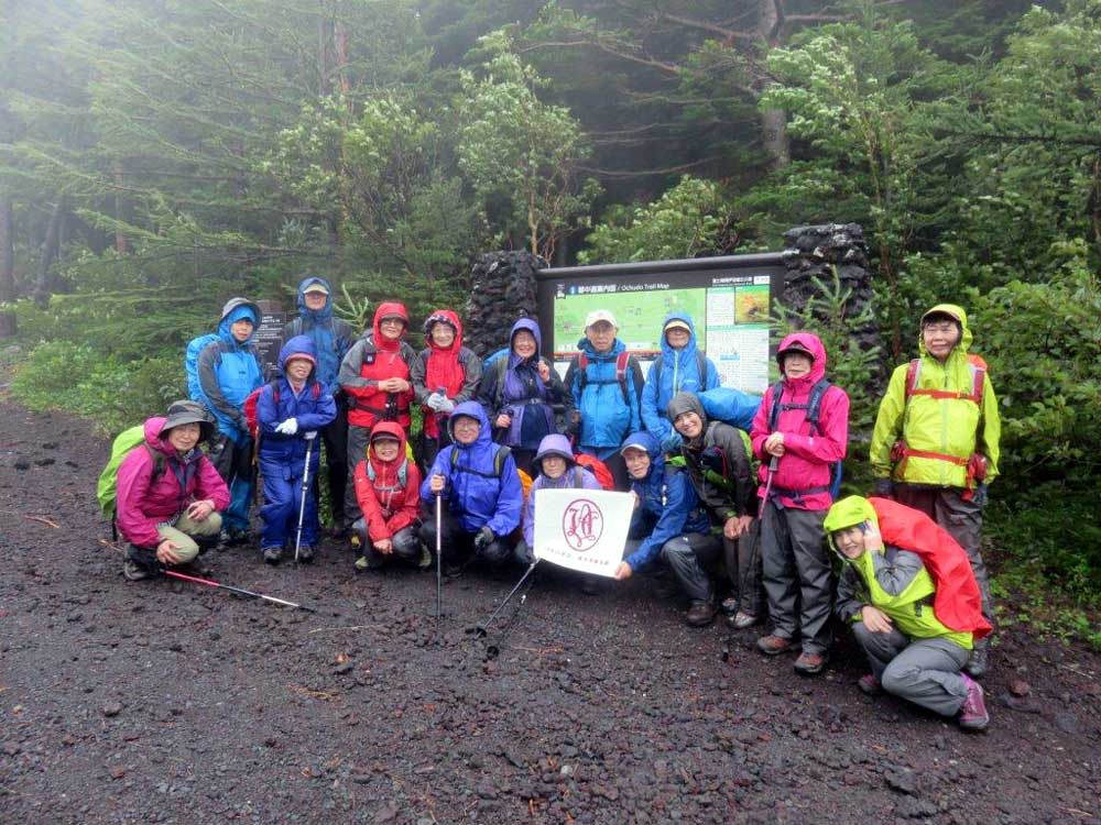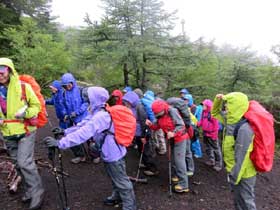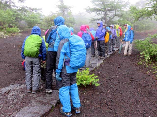 昨年、『謎解き登山のススメ?地形・地質から植生を考える?』のタイトルで講演していただいた小泉武栄先生を講師にお願いした観察会。バスの中で岩殿山は、丹沢山系とほぼ同じころに隆起した礫岩の山、富士山には側火山(寄生火山とも呼ぶ)が100以上あり、その代表的な山は大室山という説明があった。中央高速を下りてからは、大昔は萱場だった所がほぼアカマツ林になり、スバルラインの料金所を過ぎるとアカマツの他にシラカバやクマシデなどの雑木林を眺めながら、御庭の駐車場に着いた。出発した時には、雨は降っていないが、途中から雨に降られた。
