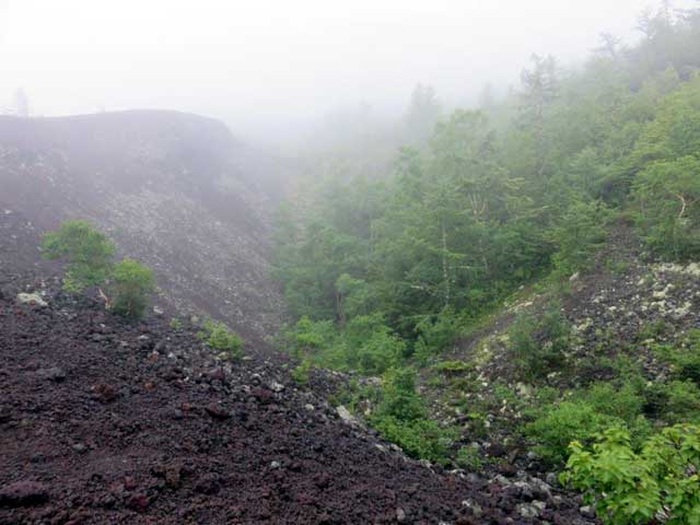 別の所では、教えていただかないとわからない点々と噴火した跡の近くで、先生の本の写真にあるハイマツのように曲がった太いカラマツが生えている。雨と時折吹く強風の中で、大沢崩れの方に向かったが、山梨県により立入禁止という看板があり、その先の大澤崩れには行かなかった。下りながら、噴火から600年が過ぎた所は、スコリアが目立つが、白いミヤマハナゴケは動きが止まった岩に生えている。